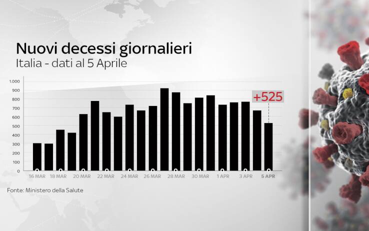 "Con il dato di oggi sui deceduti, che sono 525, registriamo il numero più basso di deceduti dal 19 marzo a oggi”, ha detto in conferenza stampa il capo della Protezione Civile, Angelo Borrelli. "Queste buone notizie non ci devono portare ad abbassare la guardia, uscire solo per comprovate necessità”, ha però aggiunto, per poi comunicare che ”da oggi non si trasferiscono più i malati fuori della Lombardia”.