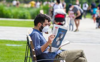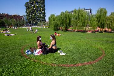 Prima domenica della Fase 2 dell’emergenza coronavirus a Milano. Nella foto, il parco della Biblioteca degli alberi dove sono stati tracciati dei cerchi sul prato per delimitare il permietro entro cui stare e rispettare così il distanziamento sociale