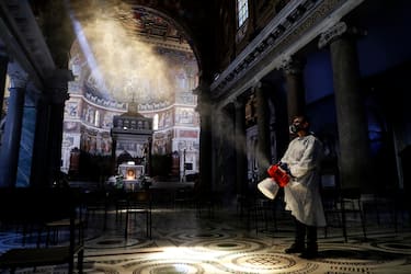 Nella basilica di Santa Maria in Trastevere, uno dei luoghi simbolo del quartiere di Roma, si lavora per sanificare l'interno della struttura, per prevenire il contagio da Coronavirus durante la Fase 2