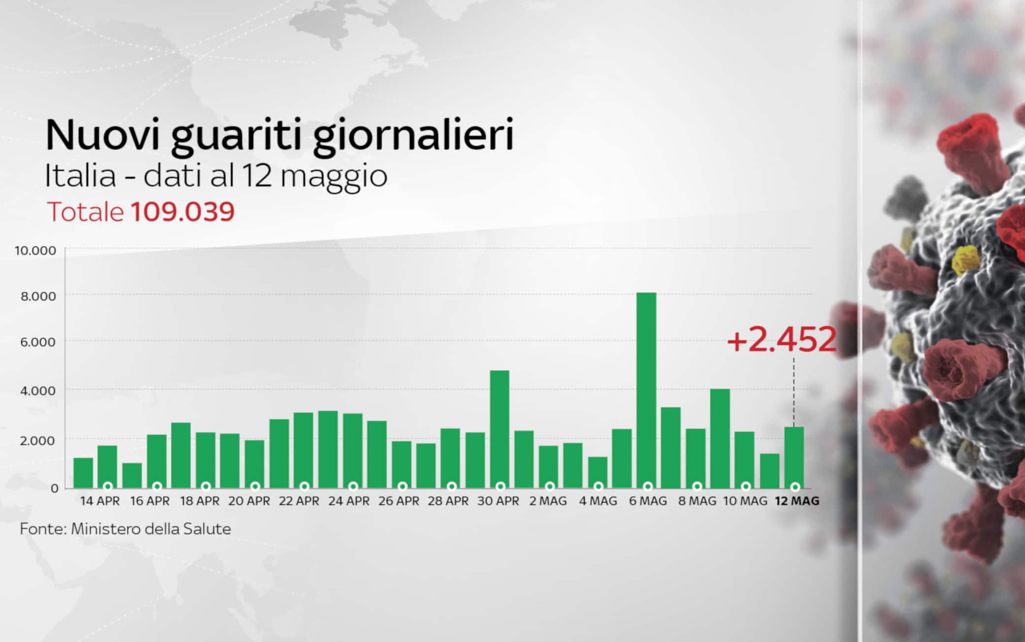 I decessi registrati oggi sono 172. I pazienti ricoverati in terapia intensiva sono 47 in meno rispetto a ieri e il totale scende a 952. Nelle ultime 24 ore sono guarite 2.452 persone. I tamponi eseguiti sono un totale di 2.673.655