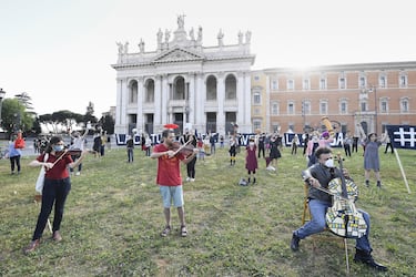 I lavoratori dello spettacolo hanno organizzato un flash mob in piazza San Giovanni a Roma per accendere i riflettori sulla loro precaria condizione durante l’attuale crisi di coronavirus