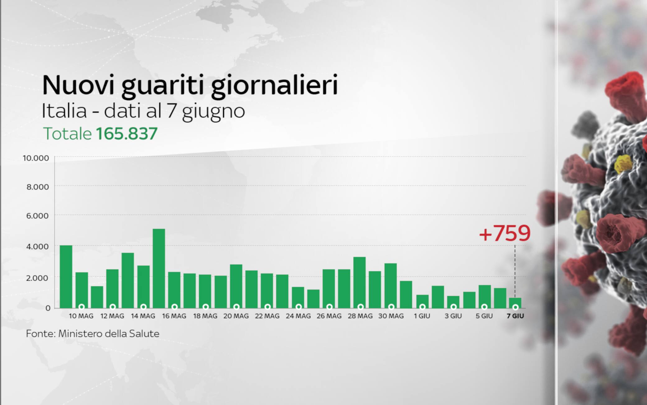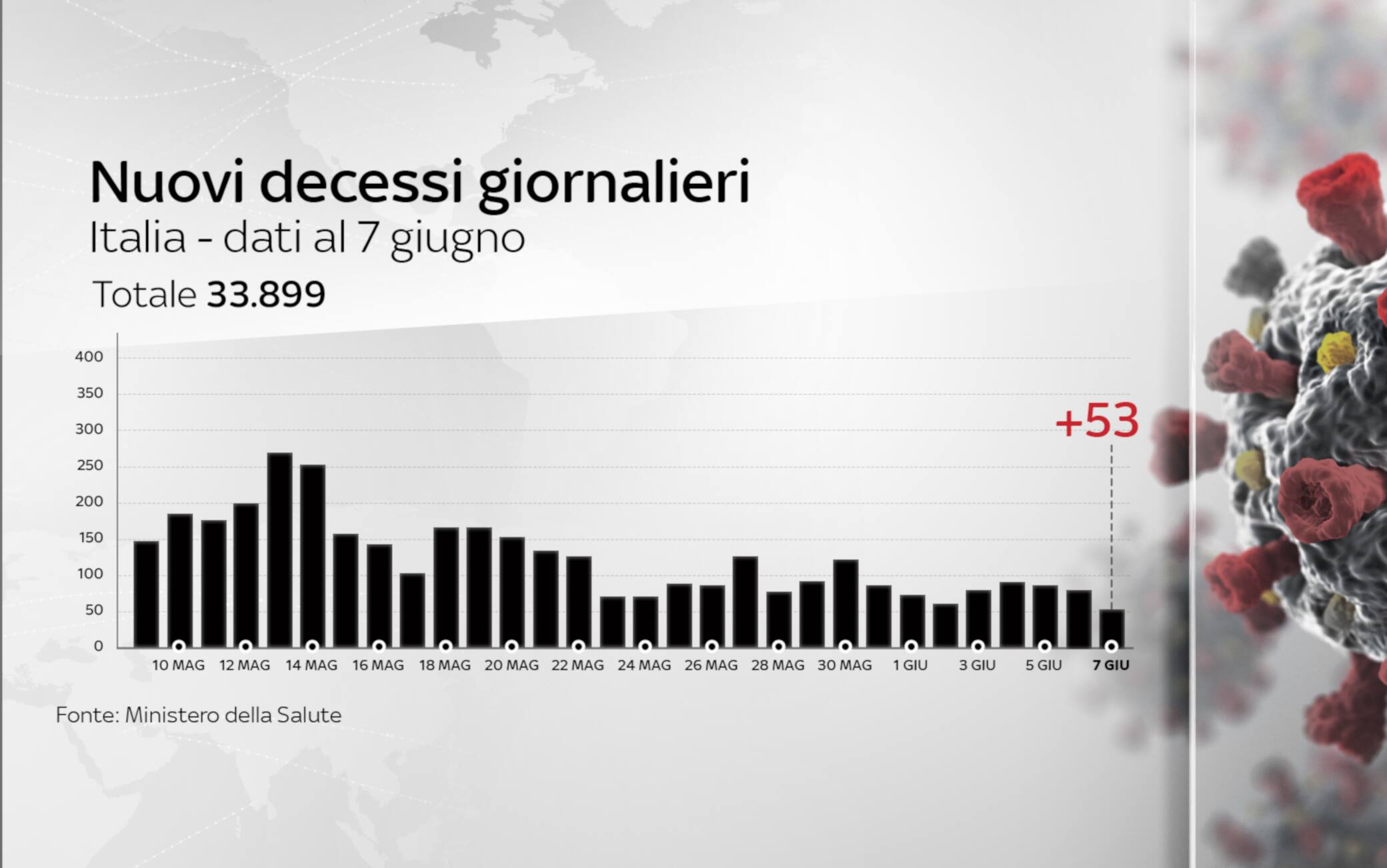 I decessi totali sono 33.899. I pazienti ricoverati in terapia intensiva sono 6 in meno rispetto a ieri e il totale scende a 287. Nelle ultime 24 ore sono guarite 759 persone, in totale sono 165.837. Sei Regioni registrano zero nuovi casi: Puglia, Friuli, Sardegna, Calabria, Molise, Basilicata. Nell'ultimo giorno sono stati eseguiti 49.478 tamponi