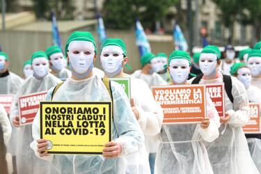 Dopo aver già manifestato in diverse piazze italiane, gli infermieri del sindacato Nursind hanno organizzato un flash mob sotto il Pirellone, sede della regione Lombardia, a Milano. I sanitari denunciano la gestione carente dell'emergenza coronavirus e chiedono più rispetto