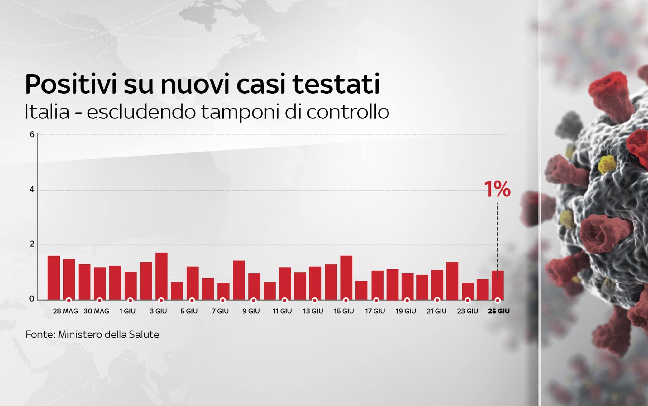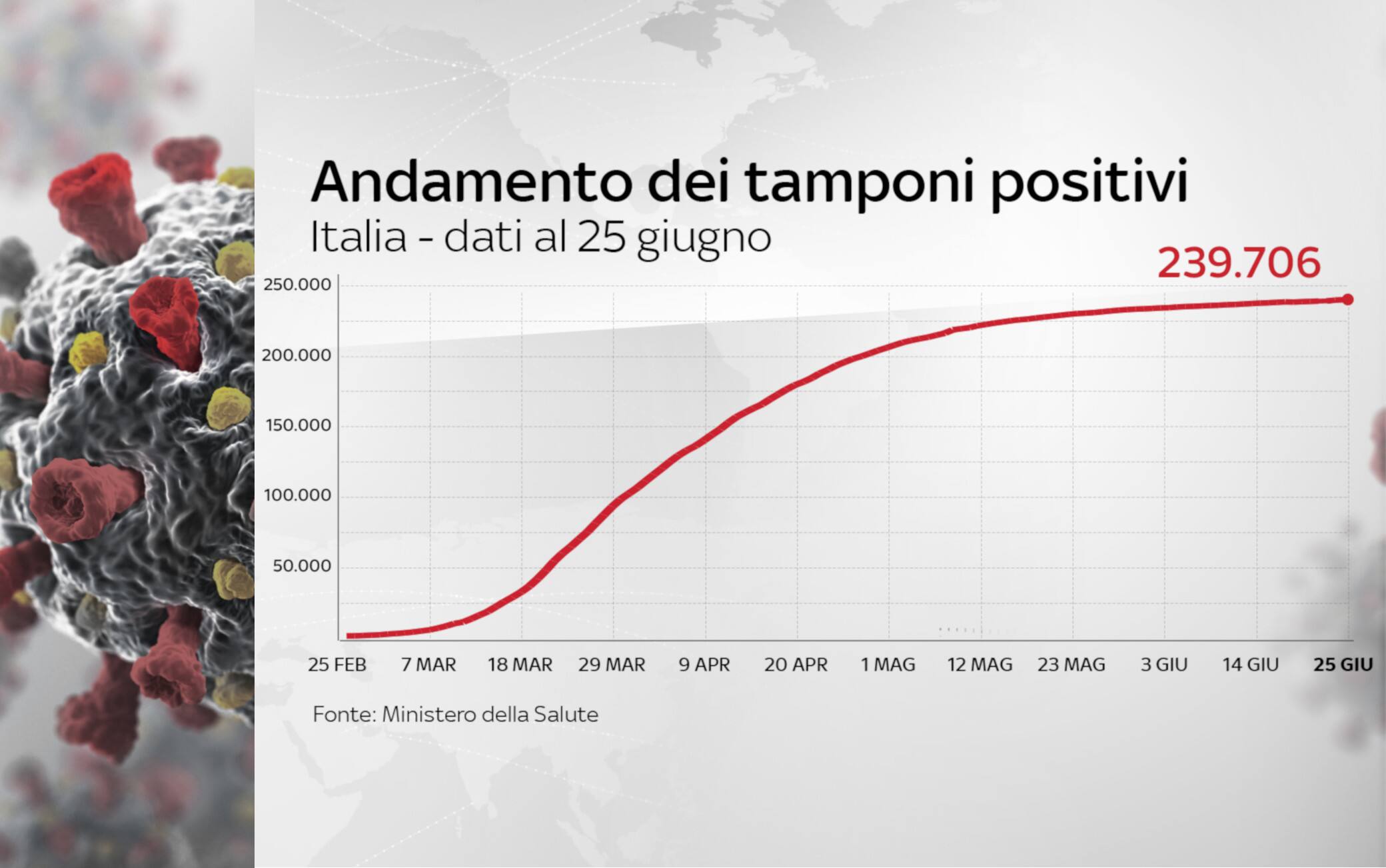 In Italia le persone complessivamente risultate positive al coronavirus, compresi guariti e deceduti, sono 239.706. Le vittime, in totale, sono 34.678, con 37 decessi nelle ultime 24 ore (ieri 30). Al dato di ieri vanno sottratti tre decessi che la Regione Marche ha escluso con un ricalcolo. Il totale dei positivi dall'inizio dell'epidemia, compresi morti e guariti, registra un incremento di 296 casi (ieri 190), di cui 170 in Lombardia. Sono sei le regioni ad aumento zero: Umbria, Friuli Venezia Giulia, Valle d'Aosta, Calabria, Molise e Basilicata, oltre alla provincia autonoma di Bolzano. Lo riportano i dati del bollettino quotidiano diffusi per la prima volta dal ministero della Salute. (GLI AGGIORNAMENTI IN DIRETTA - LO SPECIALE).