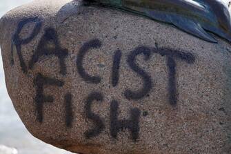 La statua, appollaiata su una roccia nel mare baltico al largo di un molo di Copenaghen, è stata sfregiata con una scritta "pesce razzista" scarabocchiata sulla base dell'opera