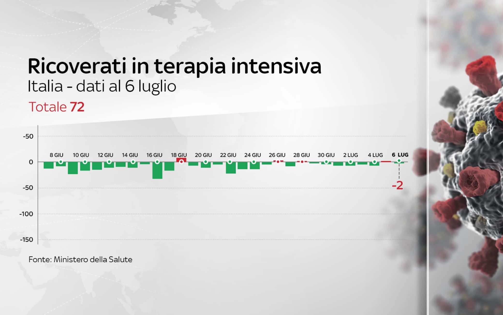 I decessi totali sono 34.869. Il numero dei positivi dall'inizio dell'epidemia, compresi morti e guariti, registra un incremento di 208. I guariti, in totale, sono 192.241, 133 in più di ieri. I pazienti ricoverati in terapia intensiva sono 72, cioè 2 in meno rispetto a ieri
