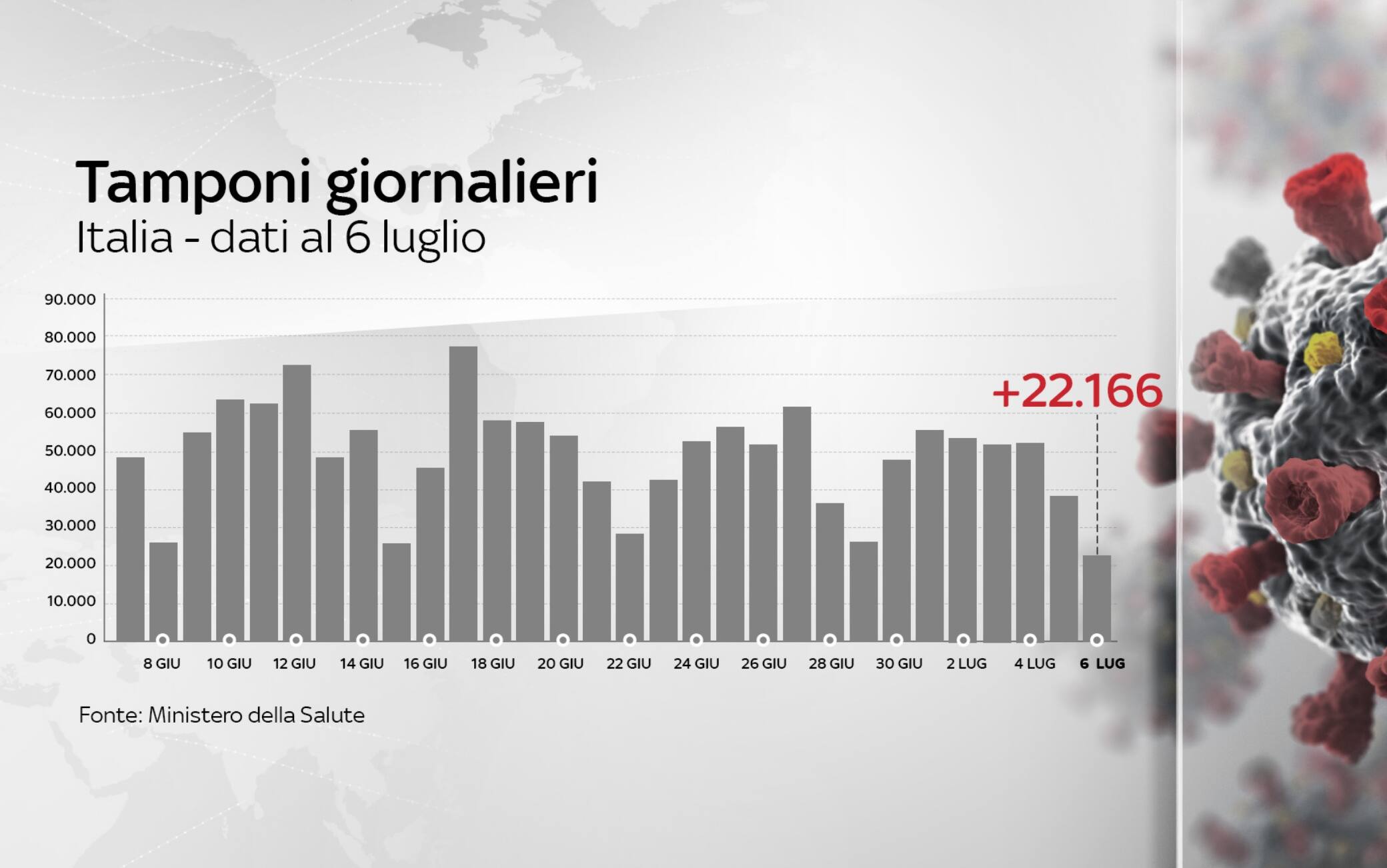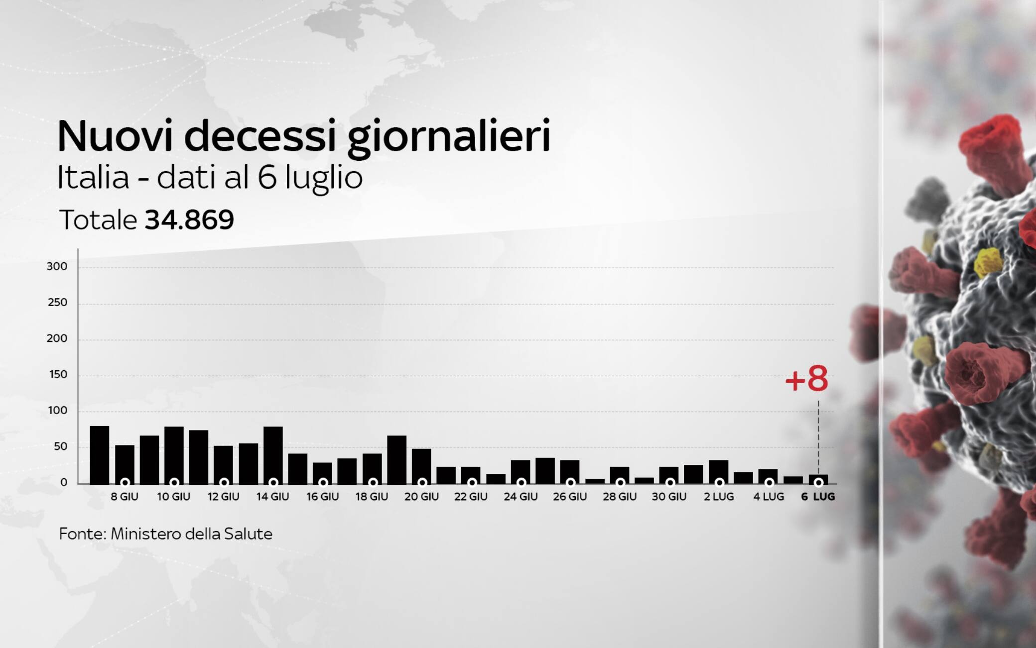 In Italia le persone complessivamente risultate positive al coronavirus, compresi guariti e deceduti, sono 241.819. Le vittime, in totale, sono 34.869, con 8 decessi nelle ultime 24 ore (ieri 7). Il totale dei positivi, compresi morti e guariti, registra un incremento di 208 casi (ieri erano 192). Di questi, 111 casi sono in Lombardia. Lo riportano i dati del bollettino quotidiano diffusi dal ministero della Salute (GLI AGGIORNAMENTI IN DIRETTA - LO SPECIALE).