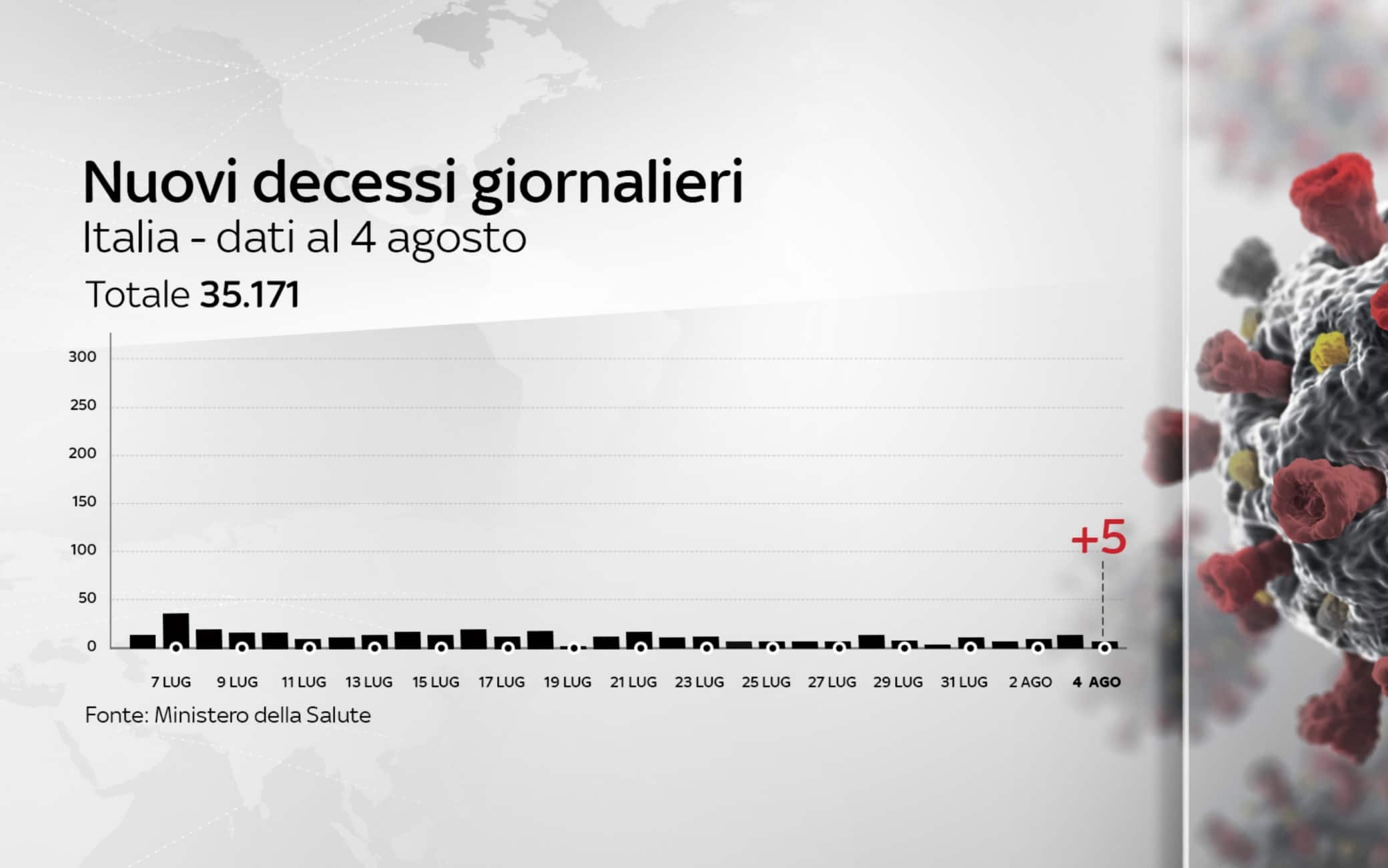 In Italia le persone complessivamente risultate positive al coronavirus, compresi guariti e deceduti, sono 248.419. Le vittime, in totale, sono 35.171, con 5 decessi nelle ultime 24 ore (ieri 12). Il totale dei positivi, compresi morti e guariti, registra un incremento di 190 casi (ieri +159). Lo riportano i dati del bollettino quotidiano del ministero della Salute (GLI AGGIORNAMENTI LIVE - SPECIALE - LE GRAFICHE).