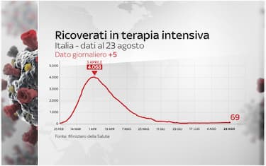 Secondo il bollettino quotidiano del ministero della Salute del 23 agosto, in Italia le persone complessivamente risultate positive al coronavirus, compresi guariti e deceduti, sono 259.345. Le vittime, in totale, sono 35.437, con 7 decessi nelle ultime 24 ore. Sono 1.210 i nuovi positivi. I pazienti ricoverati in terapia intensiva sono 69, cinque in più di ieri. Aumentano anche i ricoverati con sintomi (+47)
