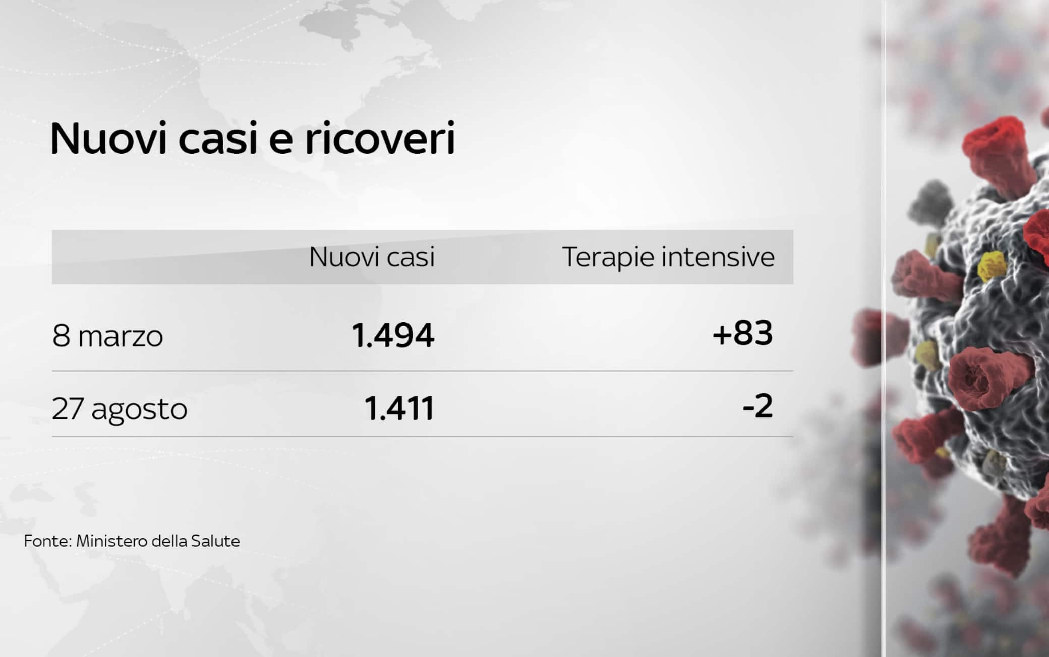 I nuovi contagi da Coronavirus in Italia, secondo il bollettino del ministero della Salute del 28 agosto, sono 1.462. Tanti i nuovi tamponi effettuati che si attestano a quota 97.065, segnando così un nuovo record per il terzo giorno consecutivo. Il numero dei pazienti ricoverati in terapia intensiva resta relativamente basso da settimane: ad oggi sono 74 (ieri 67, +7). Sempre sulle terapie intensive, si conferma l'andamento molto diverso rispetto ai mesi scorsi: l'8 marzo a fronte di 1.494 nuovi casi i ricoverati erano +83, mentre  il 27 agosto con 1.411 nuovi contagi le terapie intensive sono calate di 2 unità. Negli ultimi 7 giorni, inoltre, l’età media dei nuovi contagiati si è abbassata (29 anni, come riporta l'Iss) e molti sono asintomatici (TUTTI GLI AGGIORNAMENTI).