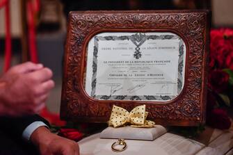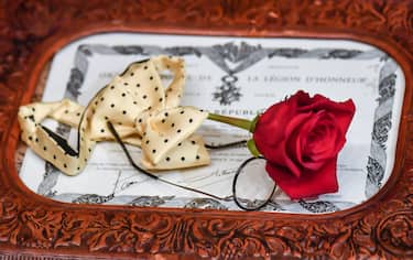 Sopra il feretro, la vedova ha posizionato la decorazione della legione d’onore, una rosa rossa, un papillon e gli occhiali, segni inconfondibili del suo look