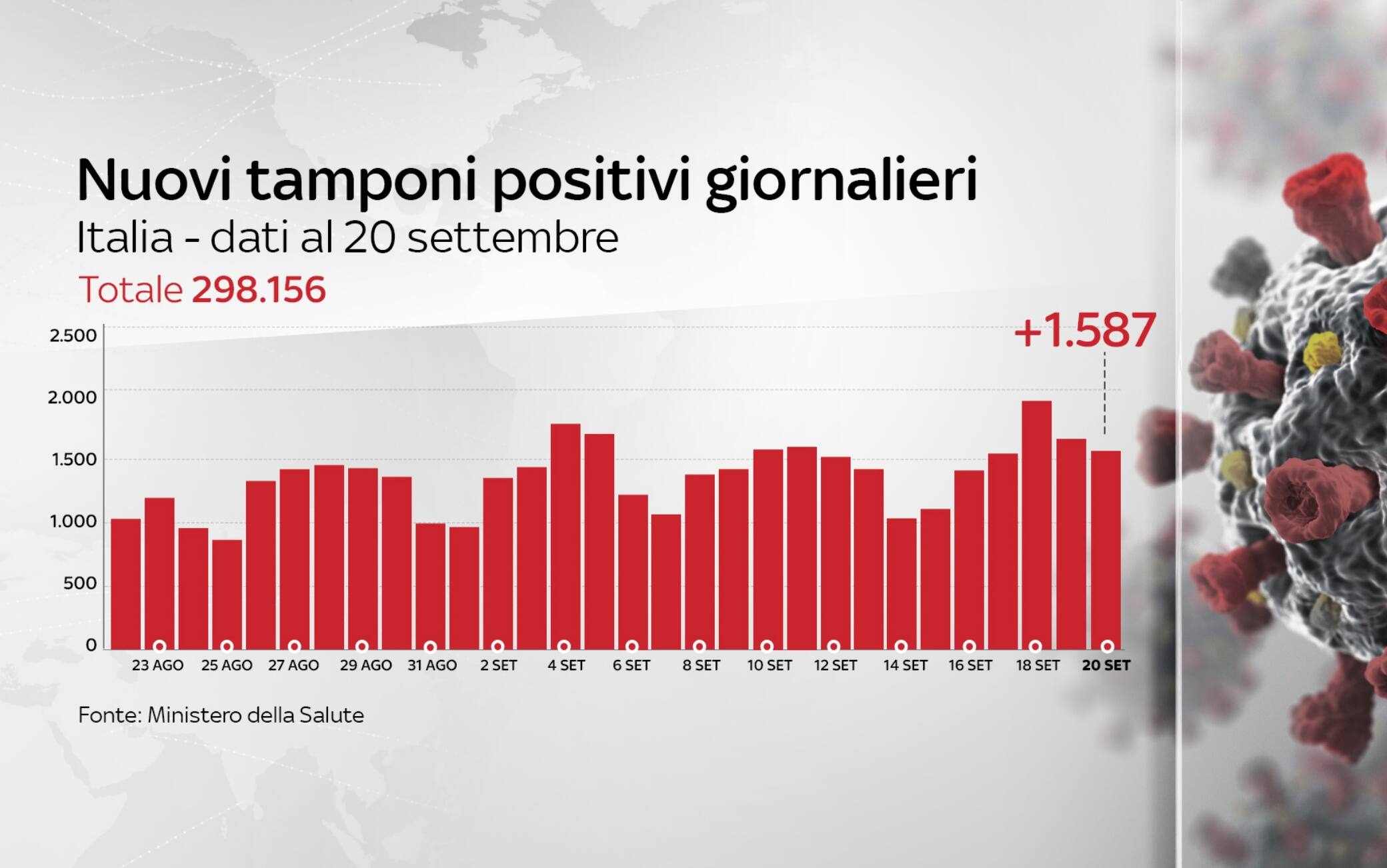 In lieve calo i nuovi contagi registrati in 24 ore, mentre scende di molto il numero di tamponi fatti (oltre 83mila, circa 20mila in meno di ieri). Sono 15 i morti, 7 i pazienti in più in terapia intensiva. È questo il quadro che emerge dal bollettino del ministero della Salute del 20 settembre (AGGIORNAMENTI IN DIRETTA - LO SPECIALE). I nuovi casi di coronavirus in Italia sono 1.587 (contro i 1.638 di ieri), sparsi in tutte le regioni tranne che in Abruzzo (che però non ha elaborato i dati del 19 e 20 settembre): in testa la Lombardia con 211, poi il Veneto con 173. I nuovi tamponi sono 83.428, mentre ieri erano stati 103.223. Sale il numero dei pazienti ricoverati in terapia intensiva: a oggi sono 222 (+7). Sulle terapie intensive, comunque, si conferma l'andamento molto diverso rispetto ai mesi scorsi: la percentuale di positivi ricoverati il 4 aprile era del 4,5%, mentre al 19 settembre è dello 0,4% (LA SITUAZIONE IN ITALIA CON MAPPE E INFOGRAFICHE).