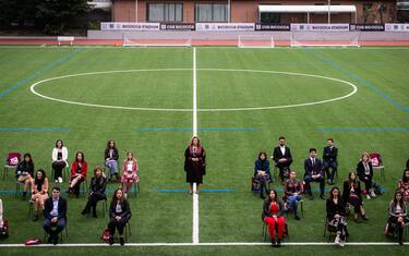 Gli studenti vengono disposti a distanza di sicurezza sul prato dello stadio, mentre familiari e accompagnatori possono sedere sui posti segnati delle gradinate dell'impianto