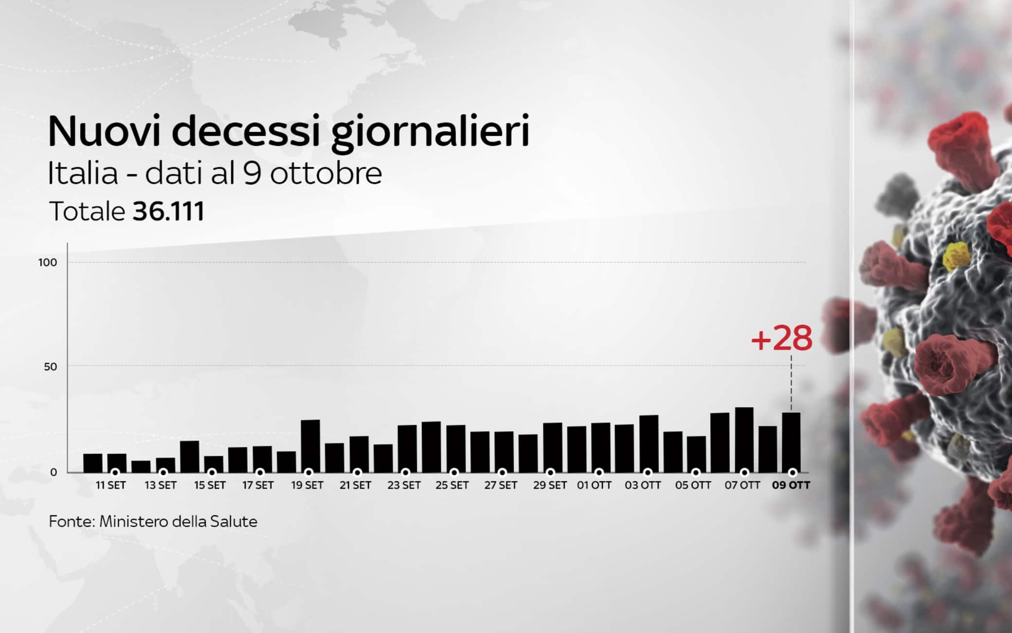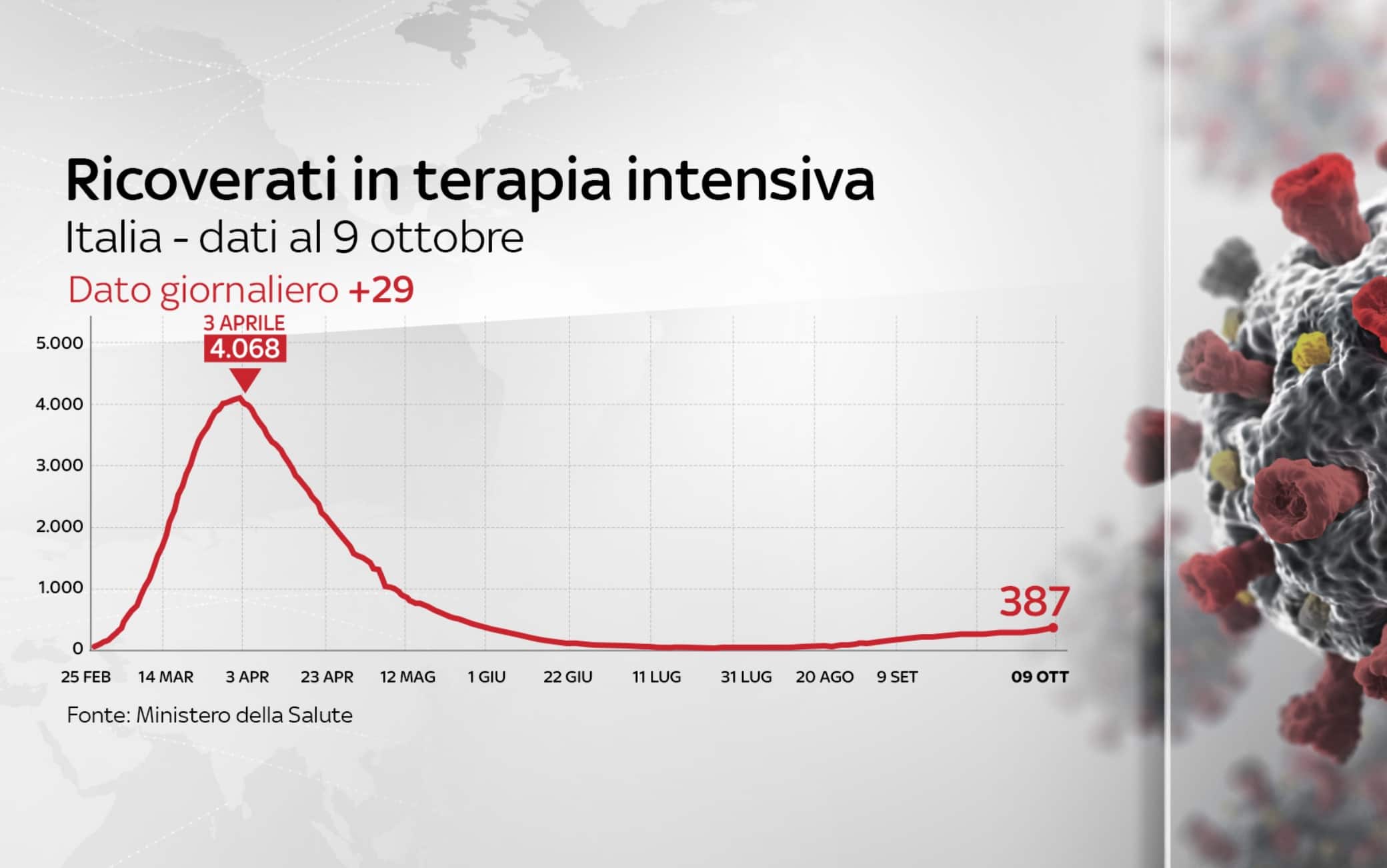 Secondo il bollettino giornaliero del ministero della Salute, si registra un aumento di nuovi positivi nelle ultime 24 ore. Crescono, rispetto al giorno precedente, anche i tamponi effettuati (oggi 129.471, ieri 128.098). I ricoverati in terapia intensiva salgono a 387 (+29). I nuovi decessi sono 28