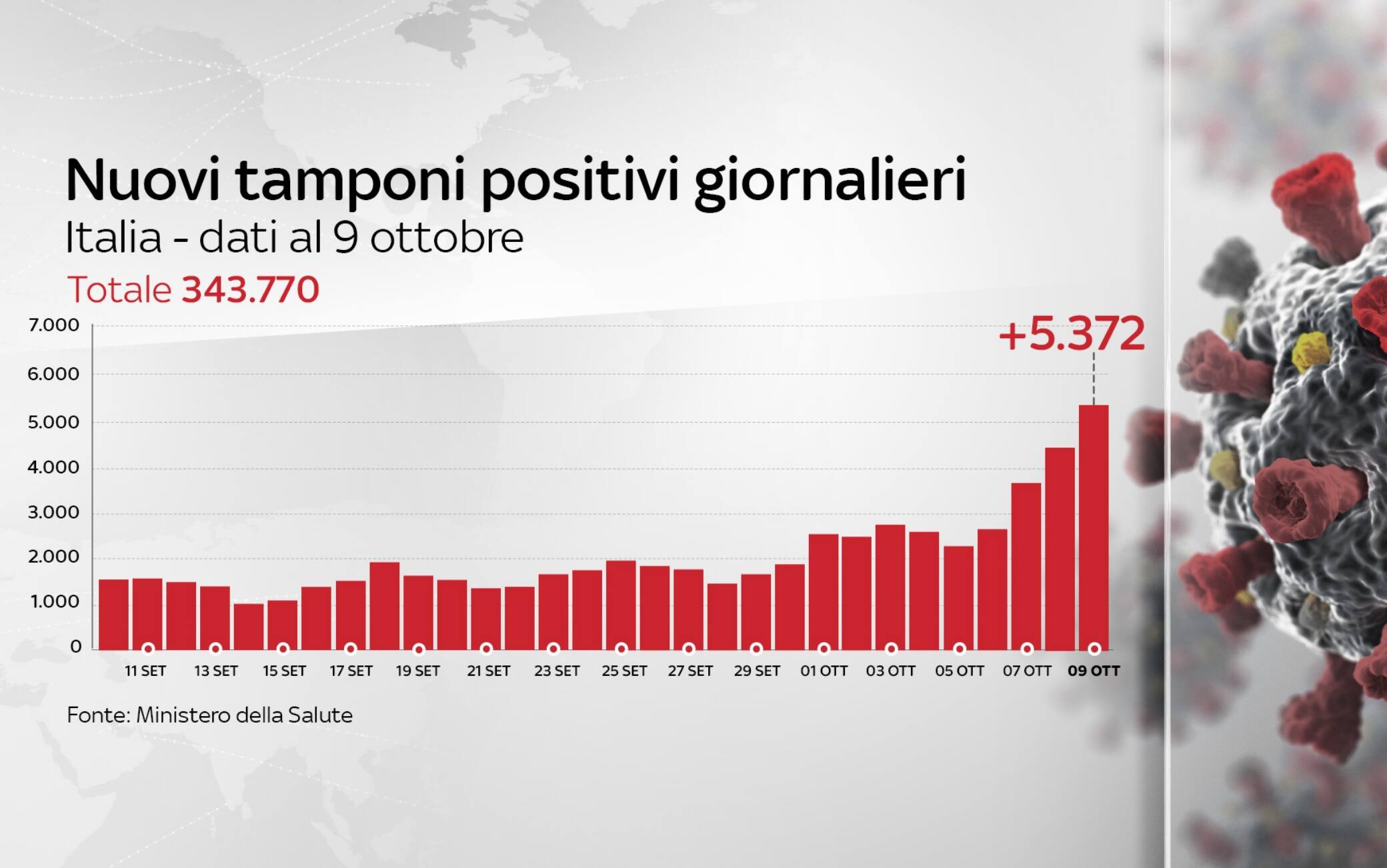 Aumentano i nuovi casi di Covid-19 registrati in Italia in 24 ore: sono 5.372, contro i 4.458 di ieri, a fronte anche di un incremento nei tamponi, che sono stati 129.741 (ieri 128.098). È questo il quadro che emerge dal bollettino del ministero della Salute del 9 ottobre (AGGIORNAMENTI IN DIRETTA - LO SPECIALE - LE GRAFICHE). I ricoverati in terapia intensiva sono 387 (+29).