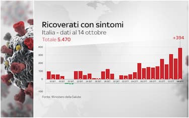 Sono 5.470 le persone ricoverate in Italia a causa del coronavirus, in aumento di 394 rispetto a ieri. Salgono le terapie intensive che arrivano a 539 (+25), mentre le persone in isolamento domiciliare sono 4.833 in più (86.436 in totale). Lo riporta il bollettino del ministero della Salute del 14 ottobre