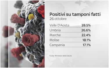 Stando all'ultimo bollettino del ministero della Salute, del 26 ottobre, i nuovi contagi da Coronavirus in 24 in Italia ore sono 17.012, su 124.686 tamponi. Valle D'Aosta, Umbria, Marche, Molise e Campania sono le cinque regioni con il rapporto più alto tra tamponi fatti e persone risultate positive