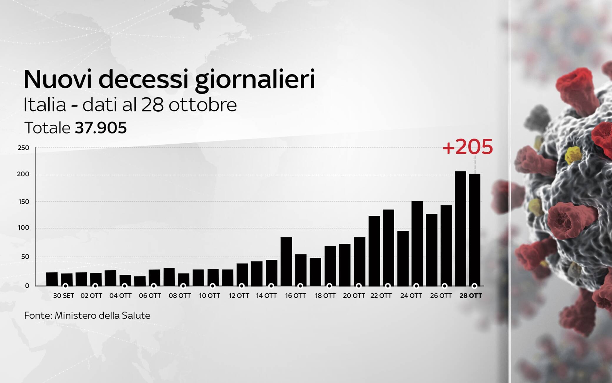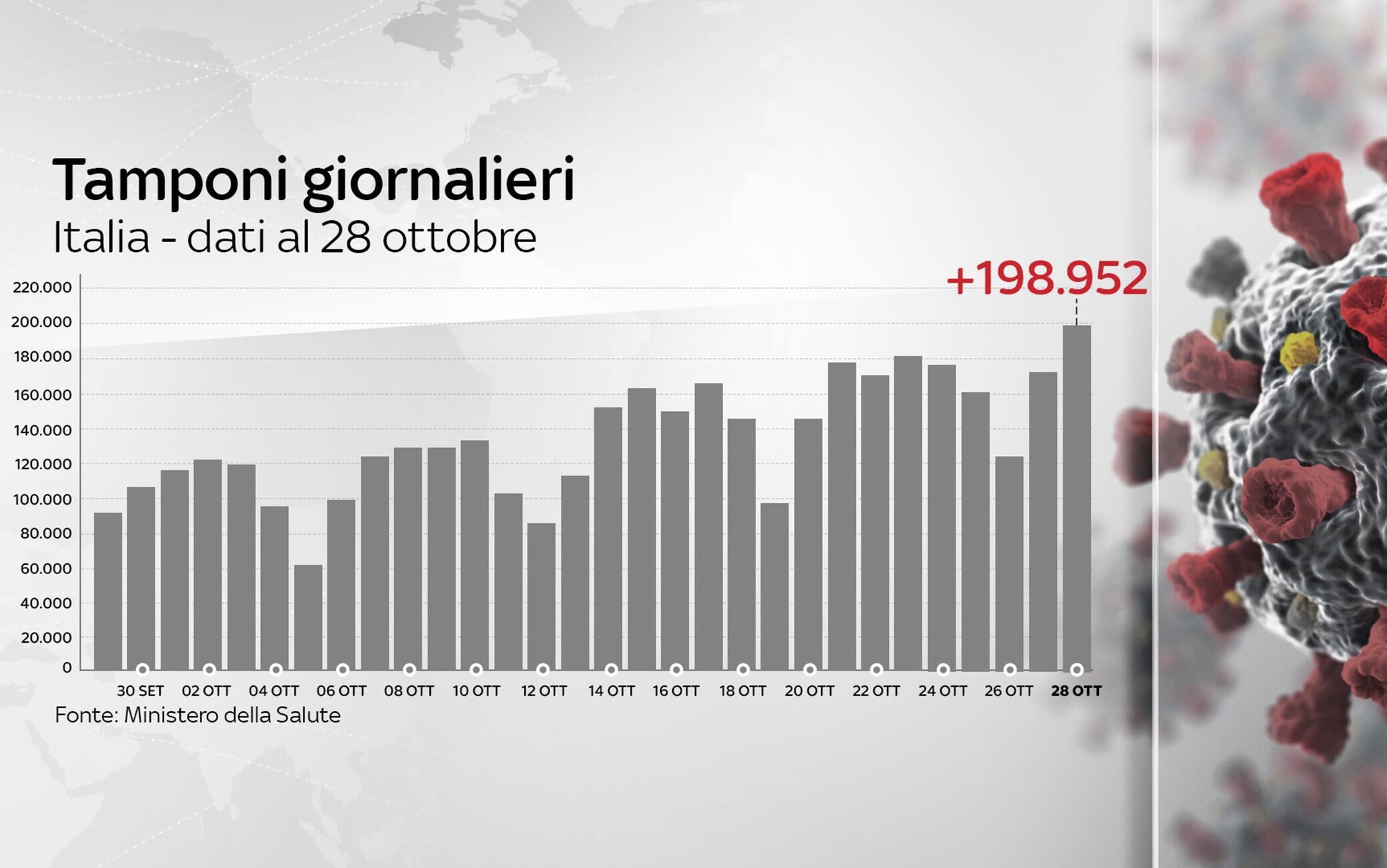 Dall'inizio della pandemia, in Italia le persone risultate positive al coronavirus, compresi guariti e deceduti, sono 589.766. Le vittime, in totale, sono 37.905, con 205 decessi nelle ultime 24 ore (ieri 221). I guariti, sempre nelle ultime 24 ore, sono 3.416, per un totale di 275.404. I ricoverati con sintomi sono 14.981 (+1.026). Sono invece 259.940 le persone in isolamento domiciliare (+20.216). I tamponi sono in tutto 15.152.038, in aumento di 198.952 rispetto al 27 ottobre. I casi testati sono finora 9.197.638, al netto di quanti tamponi abbiano fatto. Tra le note del bollettino si legge che la Regione Emilia Romagna comunica "che in seguito a verifica sui dati comunicati nei giorni passati sono stati eliminati 3 casi in quanto giudicati non casi Covid-19".