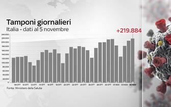 Secondo i dati pubblicati dal ministero della Salute il 5 novembre, sono 34.505 i nuovi contagi di coronavirus in Italia, su 219.884 tamponi giornalieri effettuati. I decessi, da inizio pandemia, sono un totale di 40.192