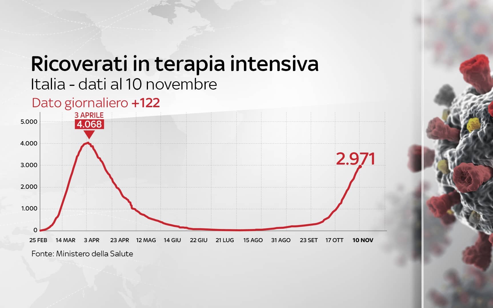Sono 35.098 i nuovi contagi di Covid-19 in Italia (ieri 25.271), a fronte di 217.758 tamponi giornalieri effettuati (ieri 147.725), con la percentuale di positivi al 16,1%. È questo il quadro che emerge dal bollettino del ministero della Salute del 10 novembre sulla situazione coronavirus in Italia (GLI AGGIORNAMENTI - SPECIALE - LA SITUAZIONE IN ITALIA). Le vittime sono 580 in un giorno, mentre le terapie intensive arrivano a 2.971 (+122). Sulle terapie intensive comunque si conferma l'andamento molto diverso rispetto ai mesi scorsi: la percentuale di positivi ricoverati il 4 aprile era del 4,5%, mentre al 9 novembre è dello 0,5%.