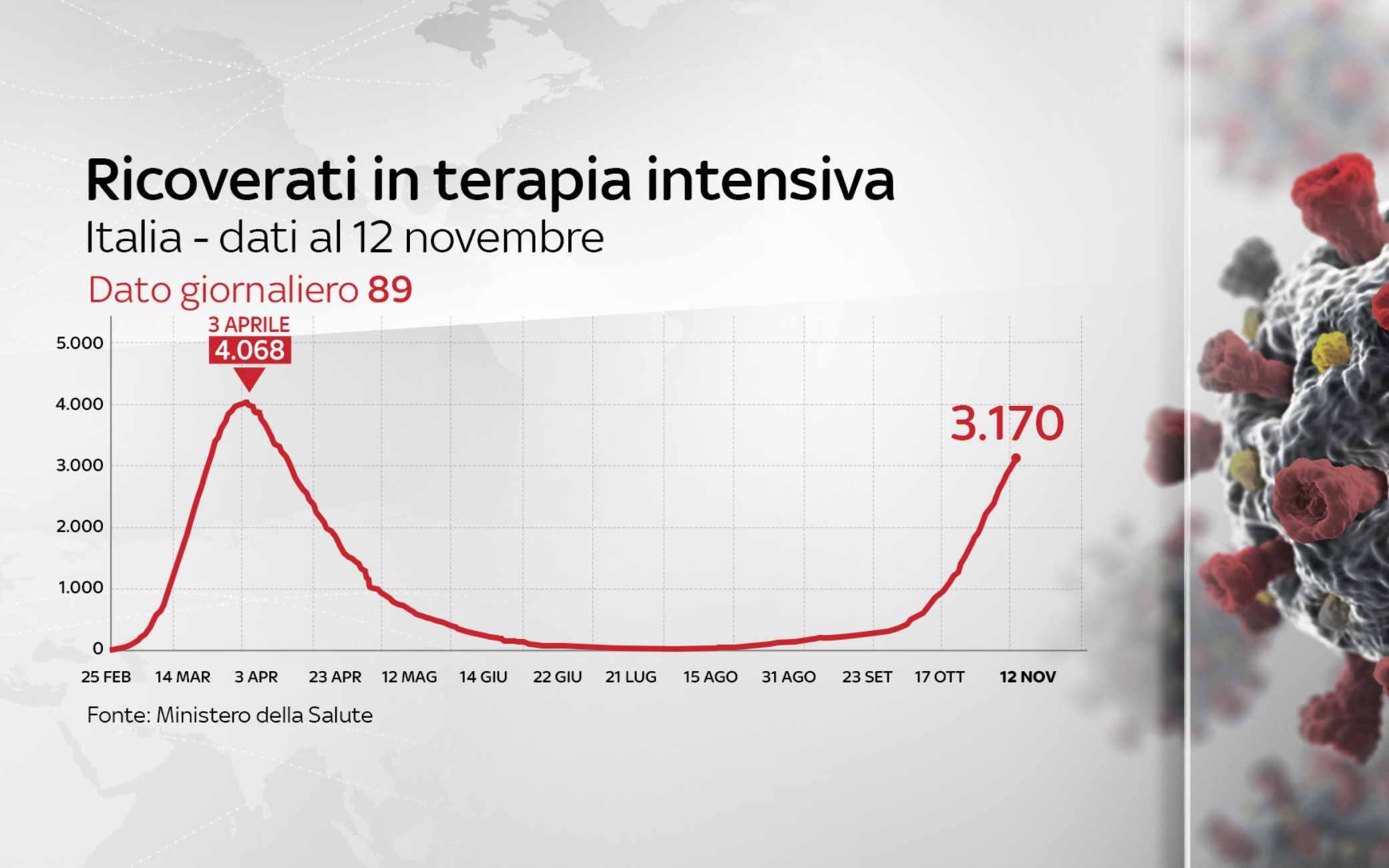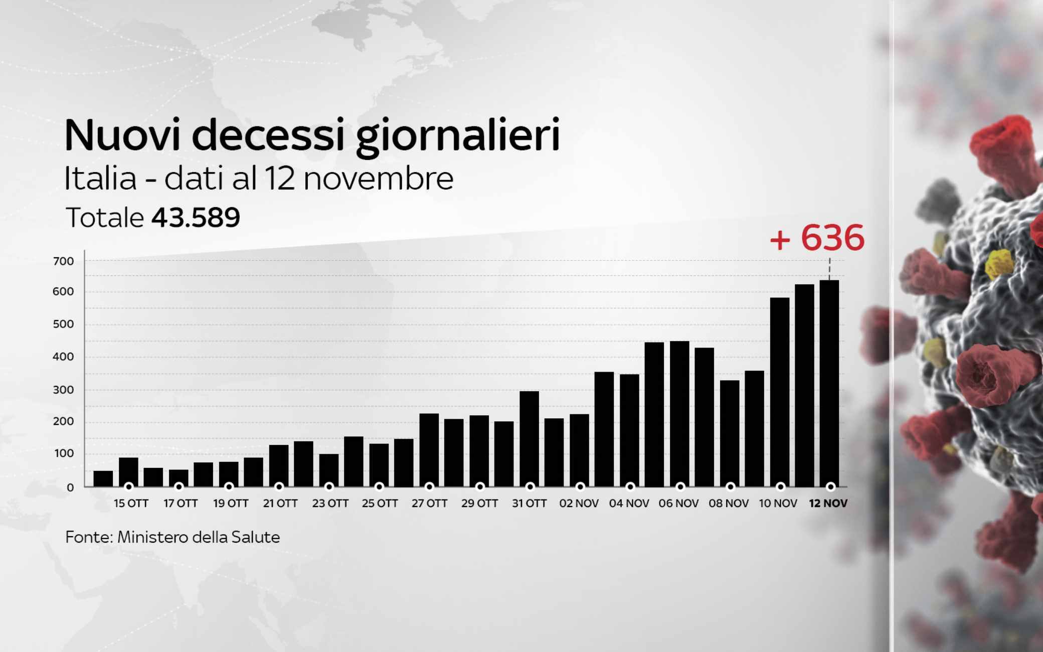 Dall'inizio della pandemia, in Italia le persone risultate positive al coronavirus, compresi guariti e deceduti, sono 1.066.401. Le vittime, in totale, sono 43.589, con 636 decessi nelle ultime 24 ore. I guariti, in un giorno, sono 15.645, per un totale di 387.758. I ricoverati con sintomi sono 29.873 (+429). Sono invece 602.011 le persone in isolamento domiciliare. I tamponi sono in tutto 18.200.508, in aumento di 234.672 rispetto all'11 novembre. I casi testati sono finora 11.025.449 al netto di quanti tamponi abbiano fatto.