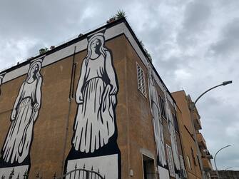 Tor Pignattara, nella zona sud-est della città, è un quartiere di case popolari con una sua anima complessa e da sempre, con l'arrivo di diversi tipi di immigrazione, in mutazione. Moltissimi dei palazzi sono decorati e ricoperti da murales monumerali come questo.