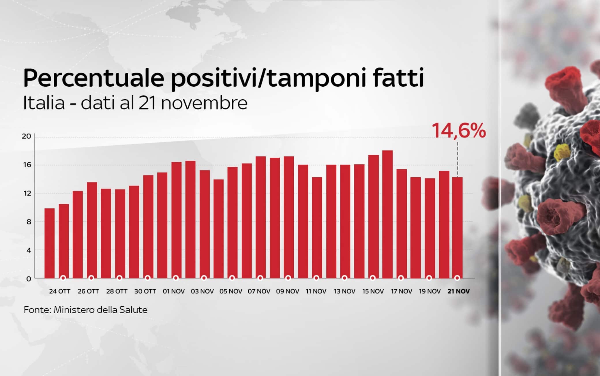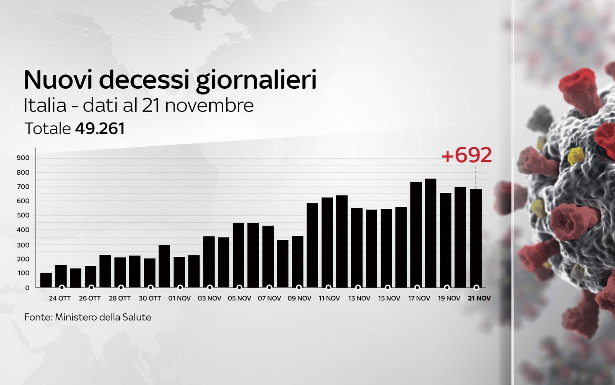 Dall'inizio della pandemia, in Italia le persone risultate positive al coronavirus, compresi guariti e deceduti, sono 1.380.531. Le vittime, in totale, sono 49.261, con 692 decessi nelle ultime 24 ore (ieri 699). I guariti, sempre nelle ultime 24 ore, sono 19.502, per un totale di 539.524. I ricoverati con sintomi sono 34.063 (+106). Sono invece 753.925 le persone in isolamento domiciliare (+14.454). I tamponi sono in tutto 20.199.829, in aumento di 237.225 rispetto al 20 novembre. I casi testati sono finora 12.120.989, al netto di quanti tamponi abbiano fatto. Tra le note del bollettino si legge che la Regione Abruzzo comunica "che in data odierna sono stati conteggiati 26 decessi avvenuti nelle settimane precedenti e non ancora comunicati"; la Regione Emilia Romagna spiega "che in seguito a verifica sui dati comunicati nei giorni passati sono stati eliminati 3 casi in quanto giudicati non casi Covid-19"; la Regione Basilicata sottolinea "che è in corso di revisione il dati sul totale casi testati e sul totale tamponi effettuati"; la Regione Friuli Venezia Giulia comunica "che nei casi odierni sono compresi 88 casi registrati oggi a sistema dal flusso dati dei laboratori privati (date di prelievo comprese fra il 27 ottobre e 17 novembre)".
