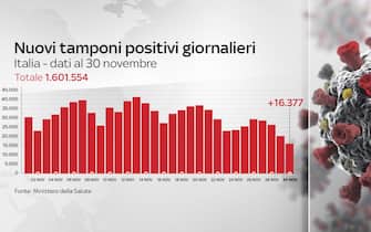 Dai dati del bollettino del ministero della Salute del 30 novembre emerge che i ricoverati con sintomi sono 33.187 (308). Continua invece a scendere il numero delle persone in terapia intensiva (3.744, -9) e quello dei soggetti in isolamento domiciliare (751.540, -7.599). I nuovi casi di coronavirus in 24 ore sono 16.377, a fronte di 130.524 tamponi e con la percentuale di positivi sui test effettuati pari al 12,5%