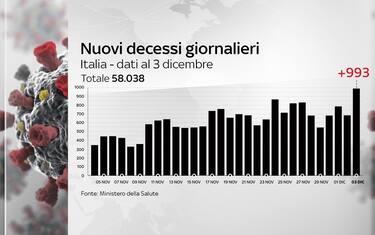 Il bollettino del ministero della Salute del 3 dicembre registra il peggior bilancio di vittime. Un numero così alto, spiega Arcuri, “non si vedeva dal 27 marzo, quando abbiamo avuto 969 decessi”. Segnalati 23.225 nuovi casi su 226.729 tamponi effettuati: la percentuale di positivi è al 10,2% (ieri 9,99%). In calo i ricoverati con sintomi (-682) e i pazienti in terapia intensiva (-19). Dall’inizio della pandemia, i contagiati - compresi guariti e vittime - sono stati 1.664.829. I morti, in totale, sono 58.038