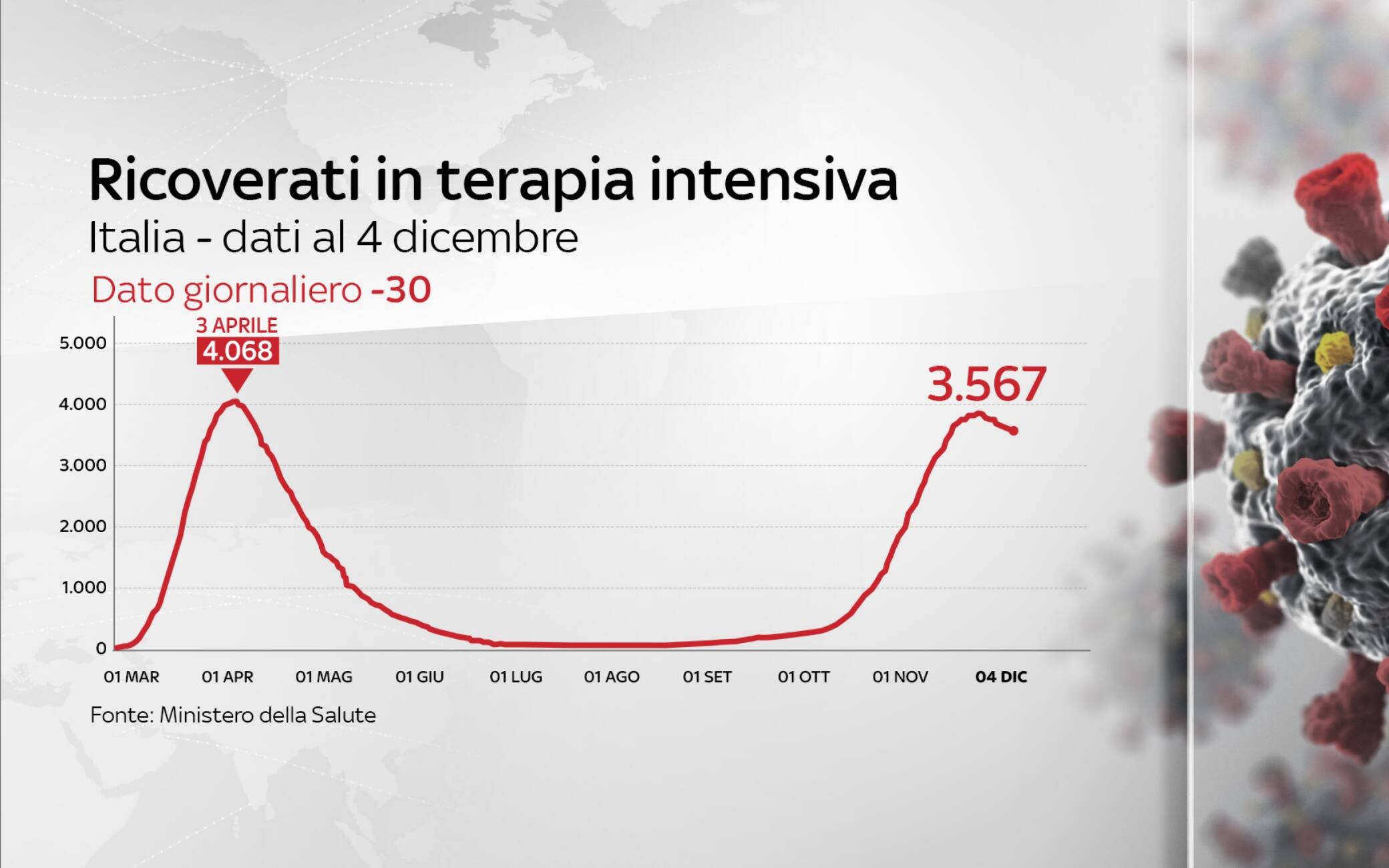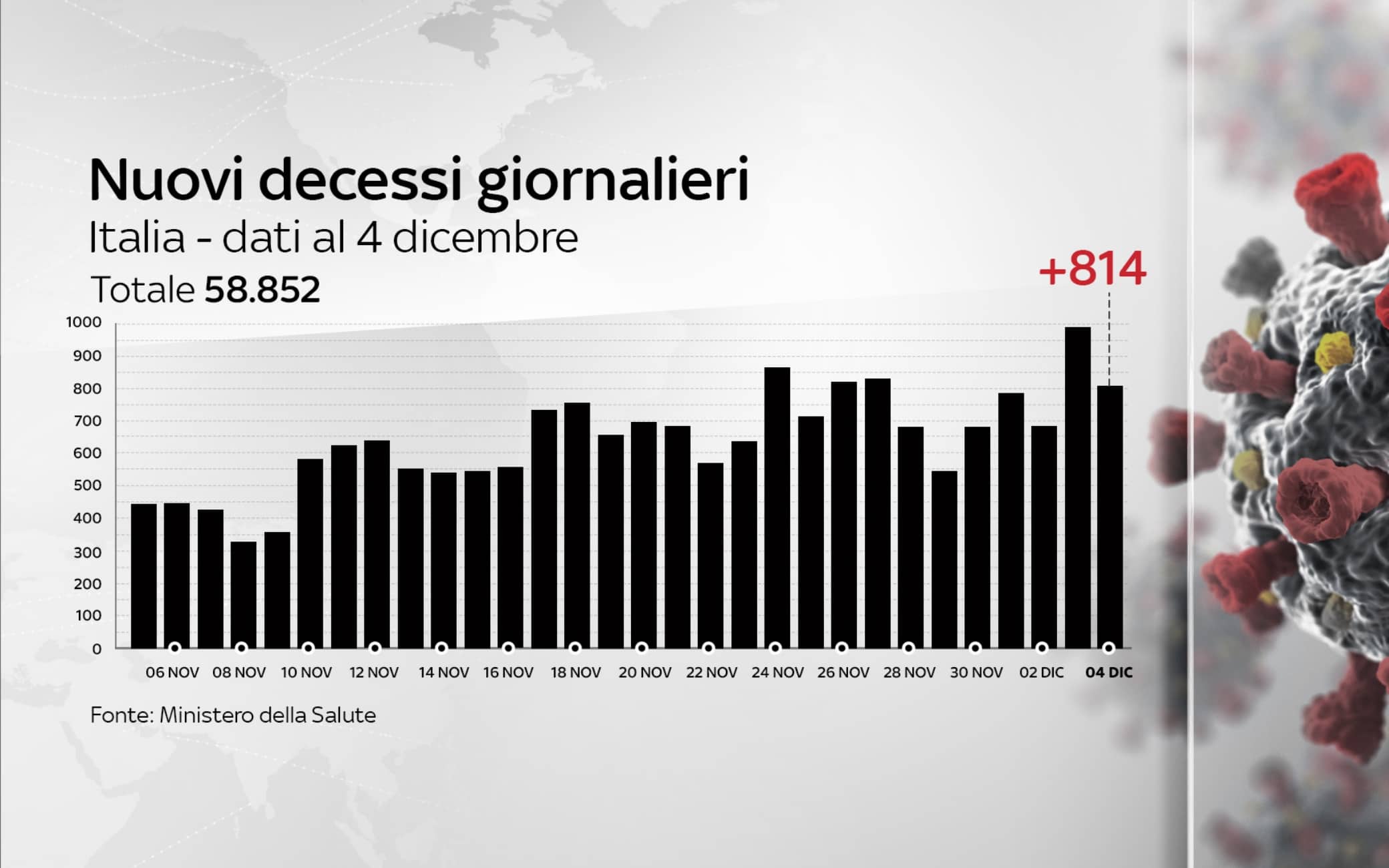 In Italia, dall'inizio della pandemia, le persone risultate positive al coronavirus, compresi guariti e deceduti, sono 1.688.939. Le vittime, in totale, sono 58.852, con 814 decessi nelle ultime 24 ore. I guariti, sempre nelle ultime 24 ore, sono 25.576, per un totale di 872.385. I ricoverati con sintomi sono 31.200 (-572). Sono invece 722.935 le persone in isolamento domiciliare (-1.678). I tamponi sono in tutto 22.767.130, in aumento di 212.741 rispetto al 3 dicembre. I casi testati sono finora 13.348.428 al netto di quanti tamponi abbiano fatto. La Regione Emilia Romagna comunica che in seguito a verifica sui dati comunicati nei giorni passati sono stati eliminati 4 casi in quanto giudicati non casi Covid.