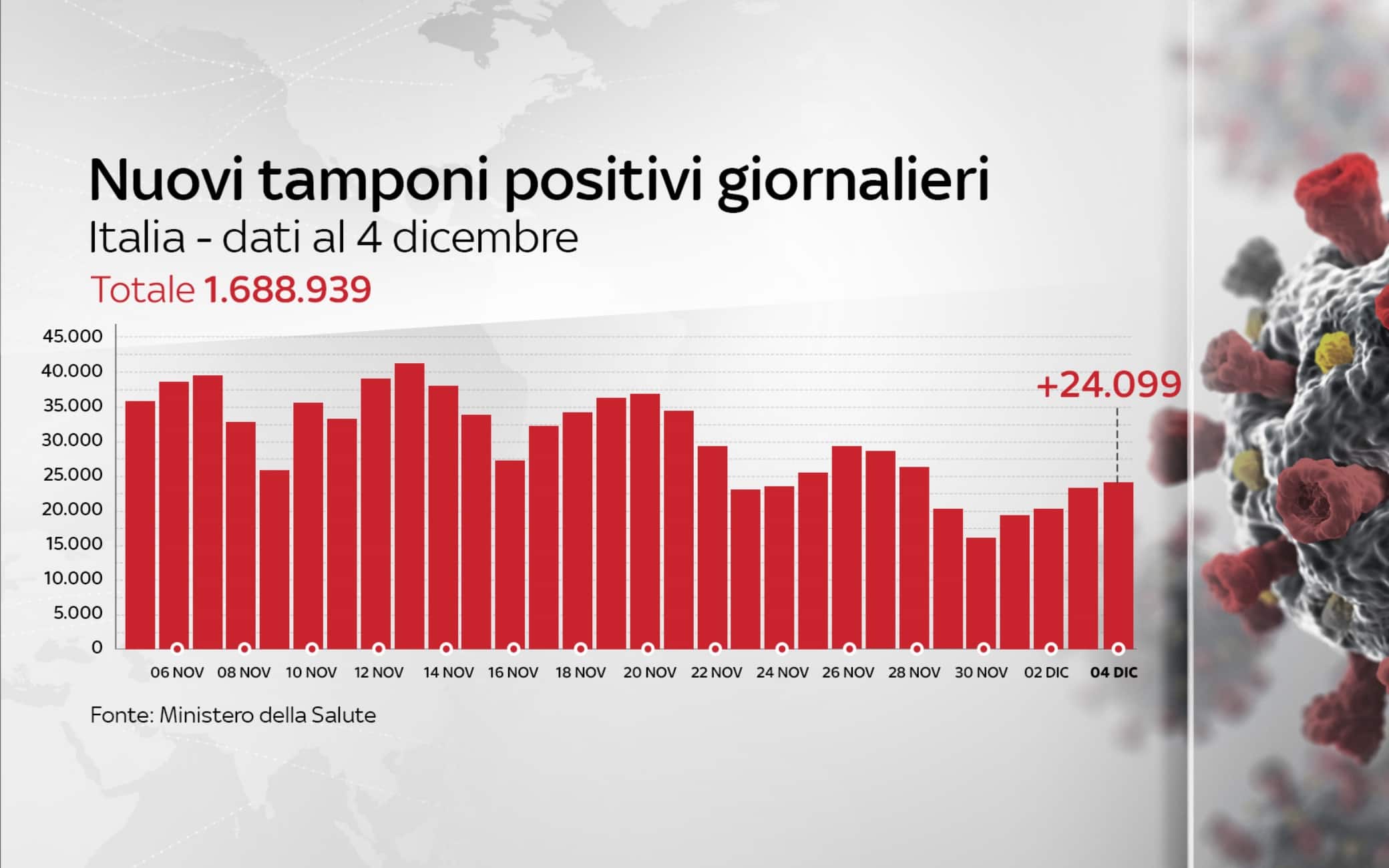Coronavirus in Italia, bollettino 4 dicembre: 24.099 casi su 212.741 tamponi, 814 morti