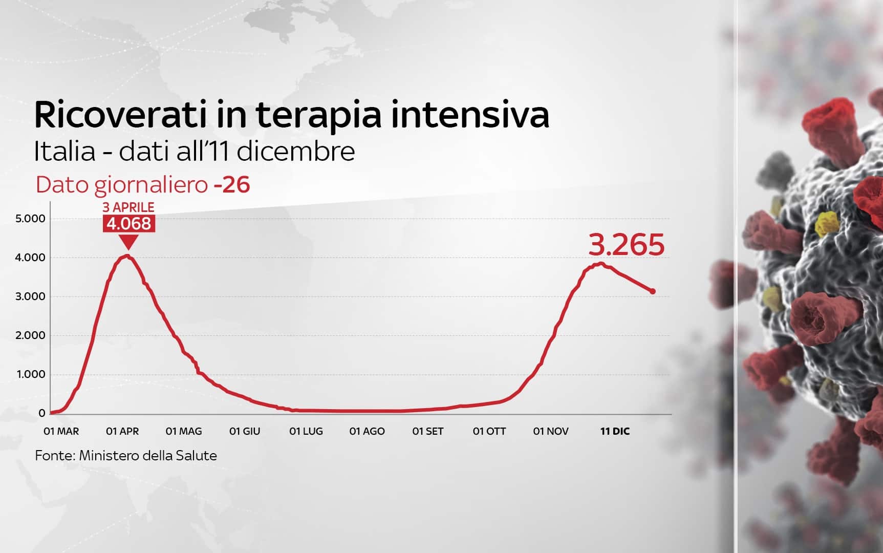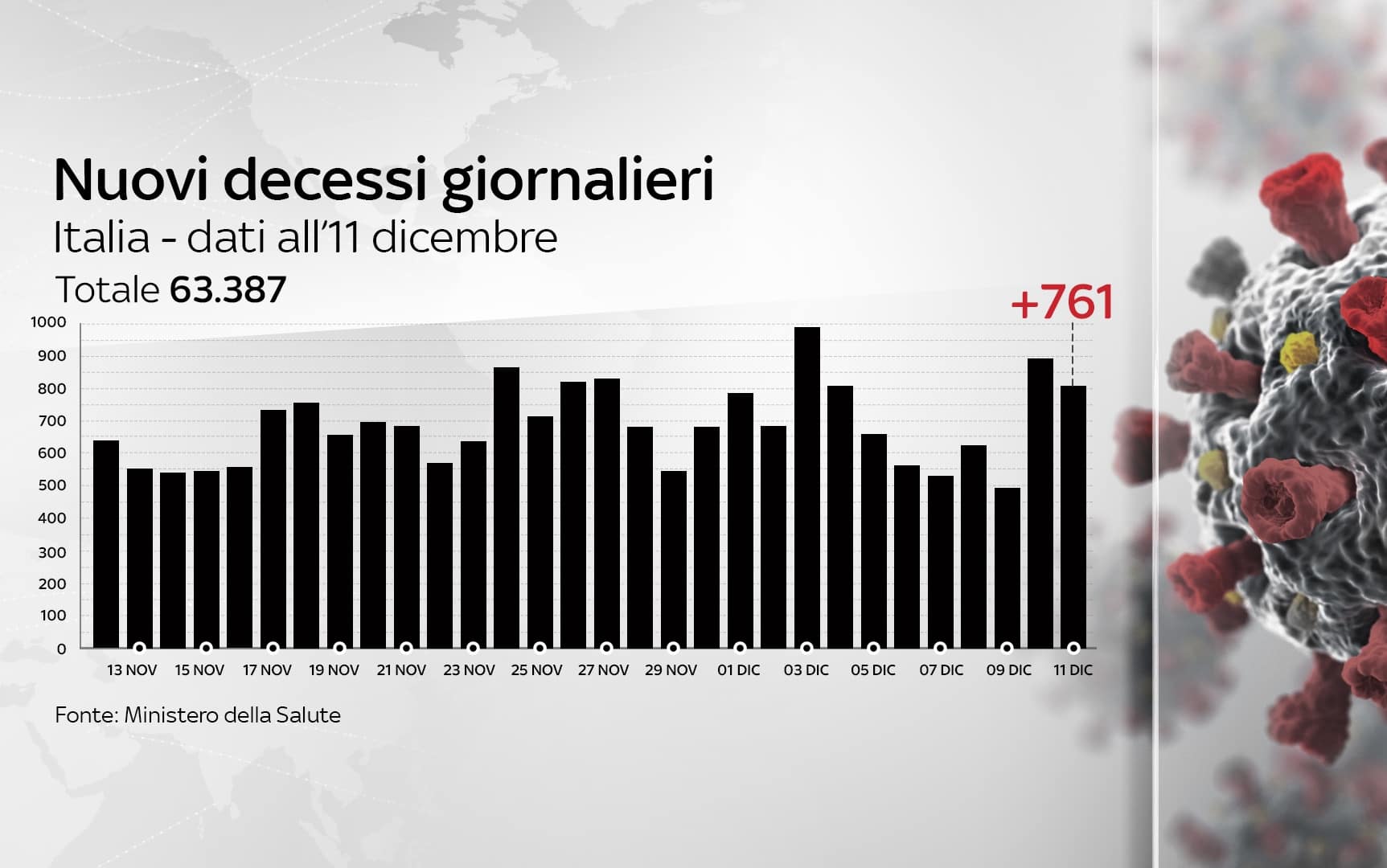 In Italia, dall'inizio della pandemia, le persone risultate positive al coronavirus, compresi guariti e deceduti, sono 1.805.873. Le vittime in totale sono 63.387, con 761 decessi nelle ultime 24 ore (ieri 887). I guariti, sempre nelle ultime 24 ore, sono 24.169, per un totale di 1.052.163. I ricoverati con sintomi sono 28.562 (-526). Sono invece 658.496 le persone in isolamento domiciliare (-5.652). I tamponi sono in tutto 23.866.590, in aumento di 190.416 rispetto al 10 dicembre. I casi testati sono finora 13.823.013, al netto di quanti tamponi abbiano fatto.