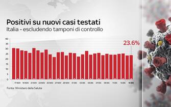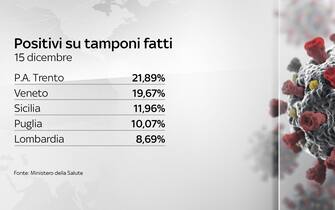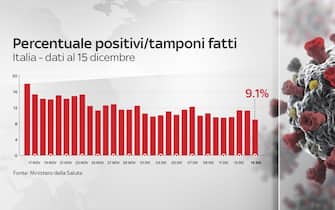 Scende la percentuale tra nuovi positivi al Covid-19 e tamponi giornalieri analizzati in Italia. Secondo i dati del bollettino del ministero della Salute del 15 dicembre, il valore - dall'11,6% di ieri - è calato al 9,1%: è il dato più basso da fine ottobre