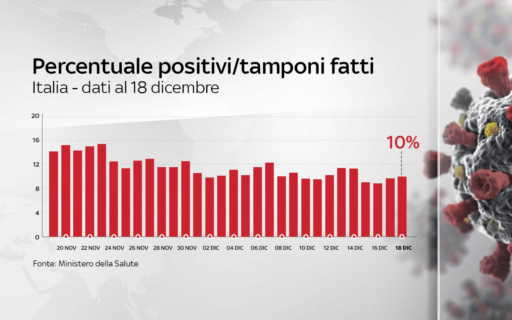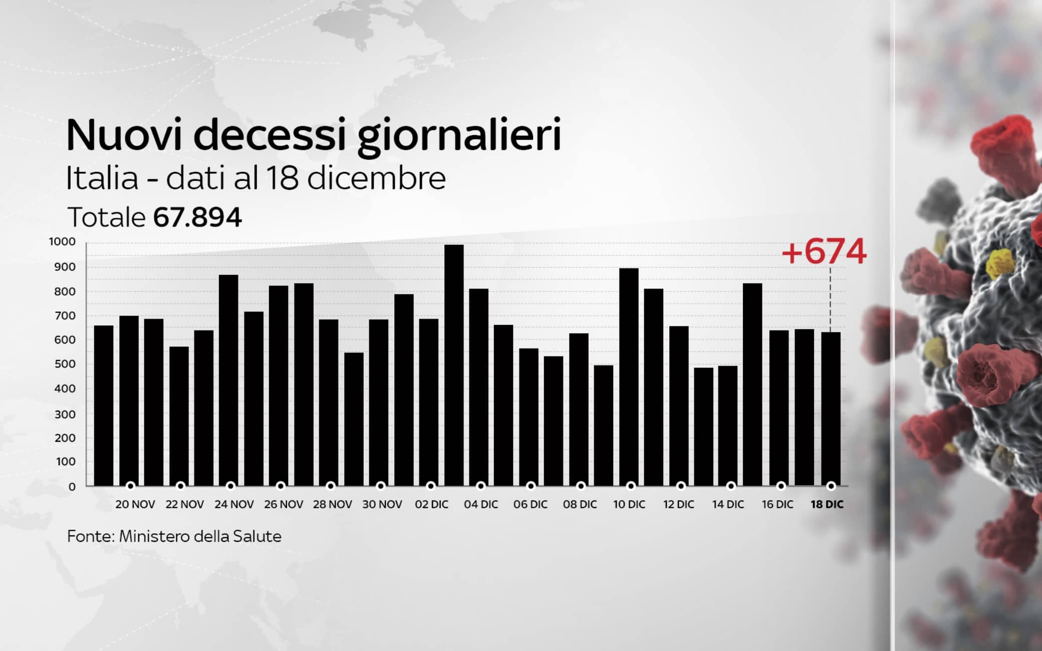 In Italia, dall'inizio della pandemia, le persone risultate positive al coronavirus, compresi guariti e deceduti, sono 1.921.778. Le vittime in totale sono 67.894, con 674 decessi nelle ultime 24 ore. I guariti, sempre nelle ultime 24 ore, sono 22.272, per un totale di 1.226.086. I ricoverati con sintomi sono 25.769 (-658). Sono invece 599.210 le persone in isolamento domiciliare. I tamponi sono in tutto 24.815.520, in aumento di 179.800 rispetto al 17 dicembre. I casi testati sono finora 14.150.088, al netto di quanti tamponi abbiano fatto.