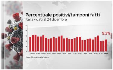 Secondo il bollettino del ministero della Salute del 24 dicembre, nelle ultime 24 ore sono stati registrati 18.040 nuovi positivi a fronte di 193.777 tamponi effettuati. La percentuale di positivi sale ancora (ieri 8,28%). Sono 505 i morti, 2.589 i pazienti in terapia intensiva, 35 in meno. Il numero dei positivi dall'inizio della pandemia, compresi morti e guariti, sale a 2.009.317