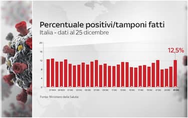 Continua a salire in Italia per il terzo giorno consecutivo la percentuale tra nuovi positivi al coronavirus e tamponi giornalieri processati. Il dato, secondo in bollettino del ministero della Salute del 25 dicembre, è al 12,5%, in aumento rispetto al 9,3% del giorno precedente e all’8,28% del 23 dicembre