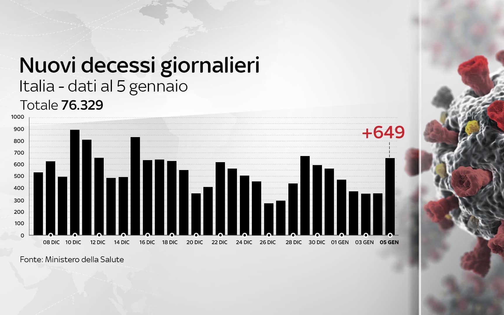 In Italia, dall'inizio della pandemia, le persone risultate positive al coronavirus, compresi guariti e deceduti, sono 2.181.619. Le vittime in totale sono 76.329, con 649 decessi nelle ultime 24 ore. I guariti, sempre nelle ultime 24 ore, sono 16.023, per un totale di 1.536.129. I ricoverati con sintomi sono 23.395 (+78). Sono invece 543.197 le persone in isolamento domiciliare. I tamponi sono in tutto 27.139.378, in aumento di 135.106 rispetto al 4 gennaio. I casi testati sono finora 15.106.666, al netto di quanti tamponi abbiano fatto.