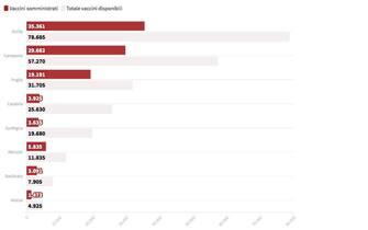 In Sicilia la percentuale di dosi iniettate è al 44,9%, cioè 35.361 su 78.685 disponibili. A rilento la Sardegna, con solo il 18,5% delle dosi somministrate finora (3.635 su 19.680)