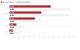 In Toscana la percentuale di dosi somministrate è al 79,9% delle 31.820 arrivate. In Umbria la quota vaccini somministrati finora è arrivata al 38,2% delle 9.835 dosi destinate alla regione. Nelle Marche la quota di vaccinati sulle dosi disponibile è al 44,2% (6.984 su 15.800)