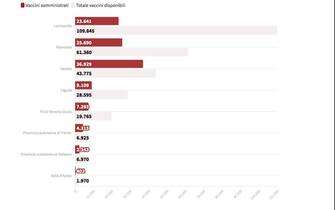 Secondo i dati, in Valle d'Aosta è stato somministrato finora il 20,4% delle dosi (402 su 1.970). In Piemonte sono state somministrate 25.690 dosi (il 41,9%) sulle 61.360 consegnate. In Liguria la quota di vaccinazioni è del 31,9%. Iniettate finora 9.109 dosi sulle 28.595 consegnate. In Lombardia, una delle regioni più indietro con la vaccinazione, finora è stato somministrato soltanto il 21,5% delle 109.845 dosi ricevute