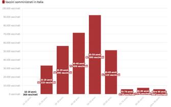La fascia d'età a cui sono state iniettate più dosi è quella 50-59 anni (92.000 vaccinazioni), seguita dalla fascia 40-49 (71.426630) e da quella 30-39 (56.095)