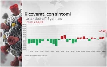 Secondo il bollettino dell'11 gennaio, i ricoverati con sintomi da Covid-19 sono in totale 23.603, con un aumento sul giorno precedente di 176 unità