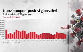 In Italia sono 11.252 i casi di Covid-19 registrati in 24 ore, per un totale di 2.553.032 contagi dall’inizio della pandemia. Lo riporta il bollettino quotidiano del ministero della Salute del 31 gennaio