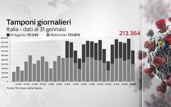 I nuovi casi sono stati rilevati su 213.364 tamponi giornalieri, compresi i test rapidi antigenici