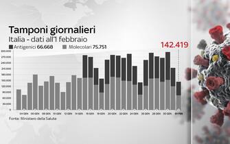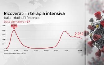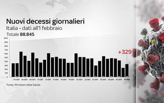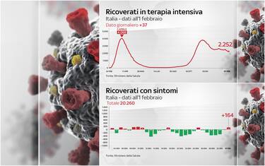 Secondo il bollettino del ministero della Salute del primo febbraio, le persone in rianimazione sono 2.252, 37 in più rispetto al giorno precedente. Salgono anche i ricoveri nei reparti non critici: sono 20.260, 164 in più. Nelle ultime 24 ore sono stati registrati altri 329 decessi, mentre ieri erano stati 237. I nuovi casi sono 7.925, su 142.419 tamponi: la percentuale di positività è al 5,56% (ieri 5,27%). Dall’inizio della pandemia, in Italia i casi ufficiali sono 2.560.957 e i morti 88.845