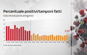 La percentuale di positivi considerando il totale dei tamponi - quindi sia molecolari sia antigenici - è al 5,56% (ieri 5,27%)