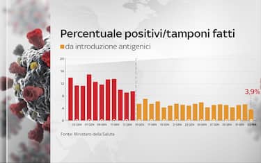 La percentuale di positivi considerando il totale dei tamponi - quindi sia molecolari sia antigenici - è al 3,95%: è in calo rispetto al 5,56% di ieri. Da qualche settimana, comunque, il dato è influenzato dal conteggio dei test antigienici rapidi che si sommano a quelli molecolari