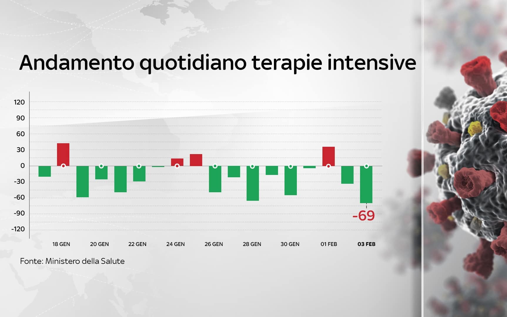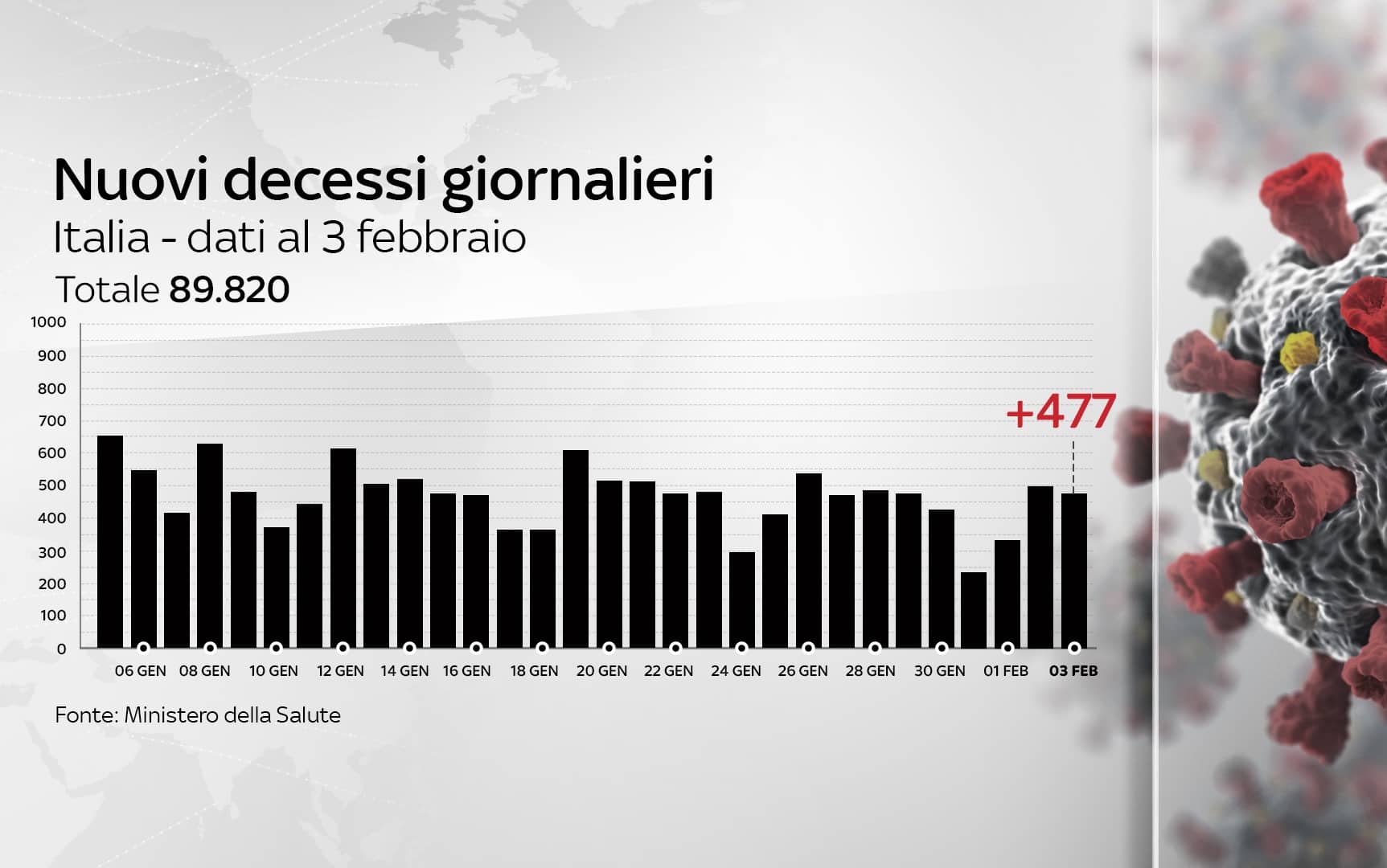 In Italia, dall'inizio della pandemia, le persone risultate positive al coronavirus, compresi guariti e deceduti, sono 2.583.790. Le vittime in totale sono 89.820, con 477 decessi nelle ultime 24 ore. I guariti in totale sono 2.059.248. I ricoverati con sintomi sono 20.071 (-246). Sono invece 412.506 le persone in isolamento domiciliare. I tamponi sono in tutto 33.332.881, in aumento di 279.307 rispetto al 2 febbraio. I casi testati sono finora 17.222.062, al netto di quanti tamponi abbiano fatto.
