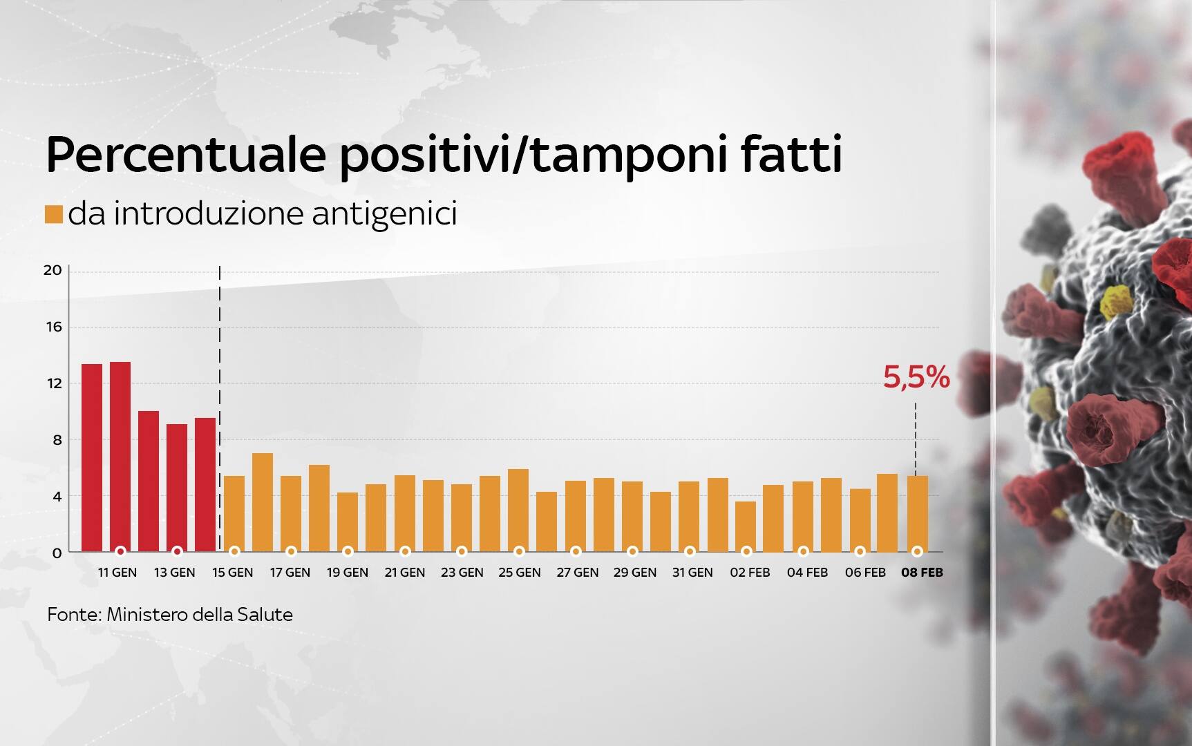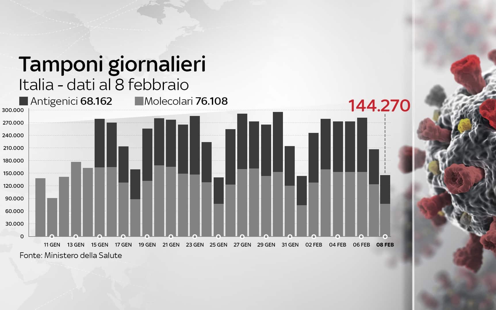 In Italia, dall'inizio della pandemia, le persone risultate positive al coronavirus, compresi guariti e deceduti, sono 2.644.707. Le vittime in totale sono 91.580, con 307 decessi nelle ultime 24 ore. I guariti, sempre nelle ultime 24 ore, sono 15.082, per un totale di 2.133.523. I ricoverati con sintomi sono 19.527 (+261). Sono invece 397.934 le persone in isolamento domiciliare. I tamponi sono in tutto 34.506.996 - di cui 31.847.929 processati con test molecolare e 2.659.067 con test antigenico rapido -, in aumento di 144.270 rispetto al 7 febbraio. I casi testati sono finora 17.757.000, al netto di quanti tamponi abbiano fatto.