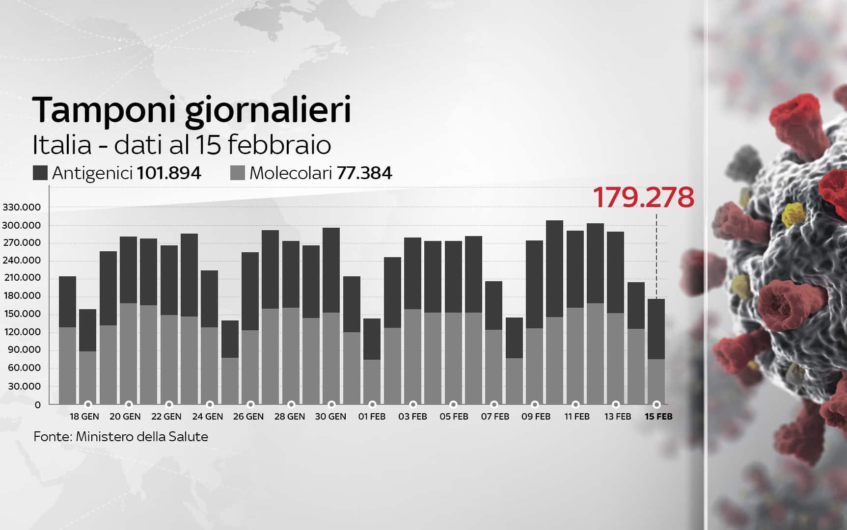 In Italia, dall'inizio della pandemia, le persone risultate positive al coronavirus, compresi guariti e deceduti, sono 2.729.223. Le vittime in totale sono 93.835, con 258 decessi nelle ultime 24 ore. I guariti sono un totale di 2.237.290. I ricoverati con sintomi sono 18.515 (+66). Sono invece 377.494 le persone in isolamento domiciliare. I tamponi sono in tutto 36.347.859 - di cui 32.816.455 processati con test molecolare e 3.531.404 con test antigenico rapido -, in aumento di 179.278 rispetto al 14 febbraio. I casi testati sono finora 18.368.000, al netto di quanti tamponi abbiano fatto.